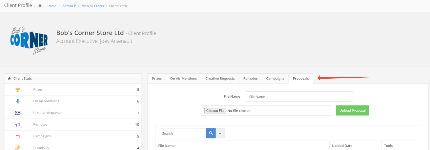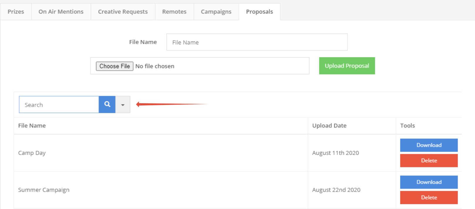From this screen you can search, download and delete client proposals.
