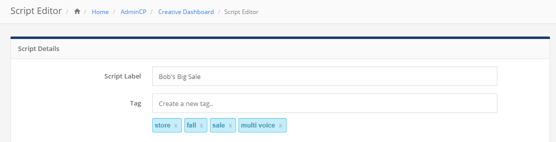 The first section is where you’ll give your script a name. This is also where you add any tags for the script. This will make finding similar scripts a breeze. This comes into play when the writers need a bit of inspiration they can search tags like “Fall” or “Sale” or “Car Dealer” as an example.