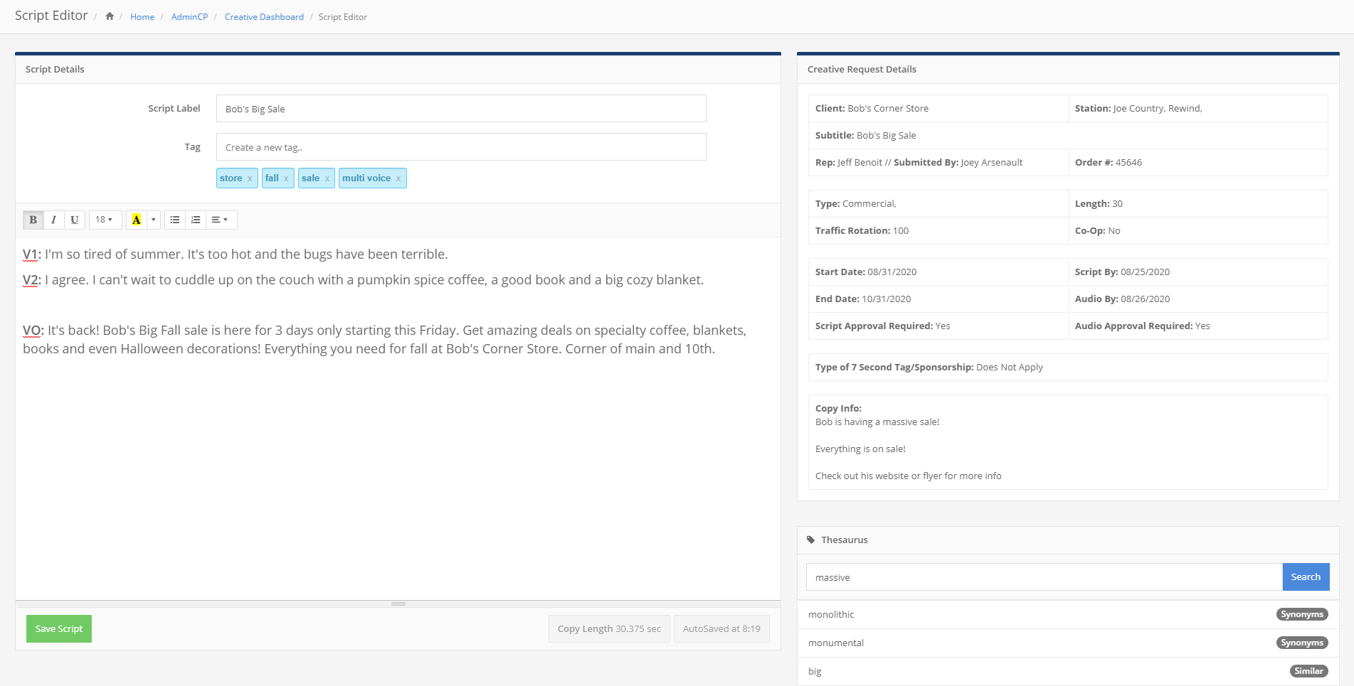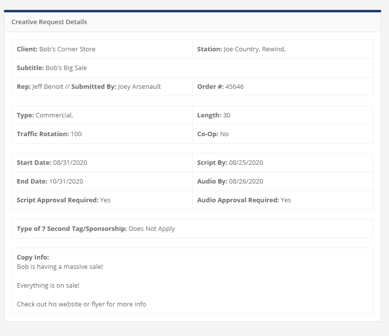 The next section shows you all the details from the new copy request. This shows up just on the right of the script so all the information you need it right there while you write.