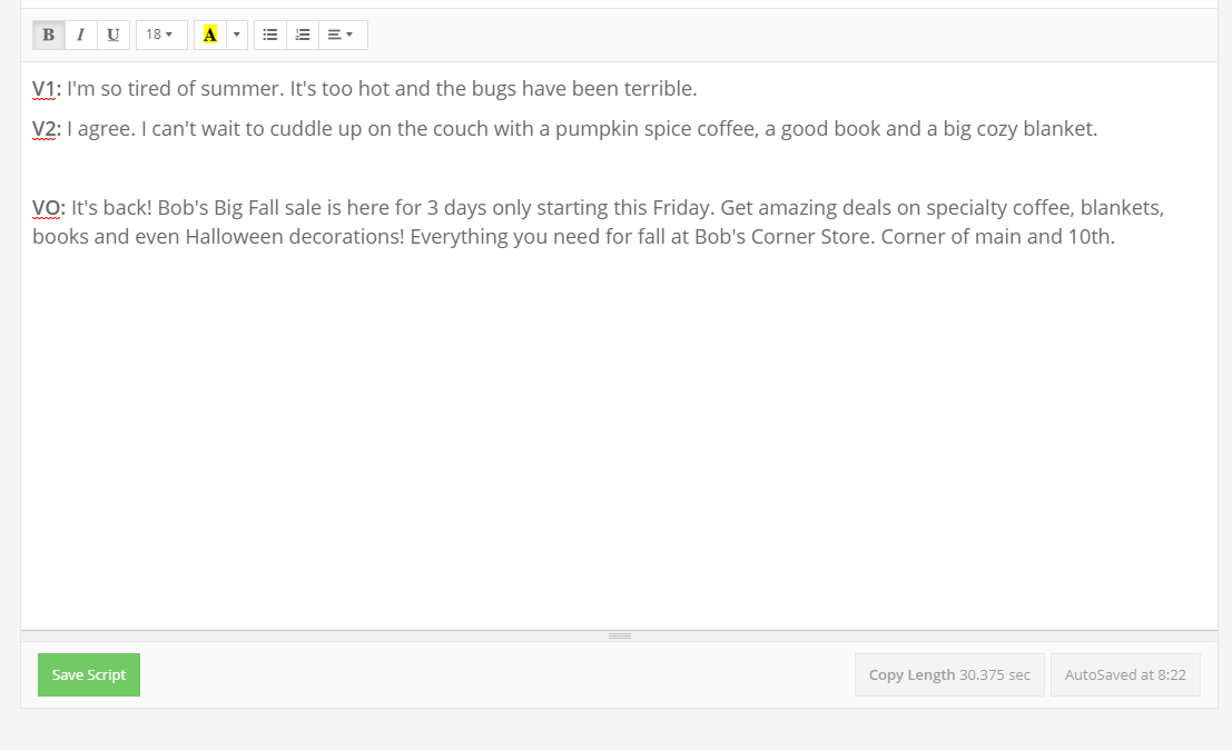 The second section is the actual word processor. This is where you’ll write the script. This section also tracks approx. how long a script will take to read. You can highlight text, bold text, italicize, change the font size and so on. The script is also auto saved every minute but you can click Save Script at any time to make sure you don’t lose anything!