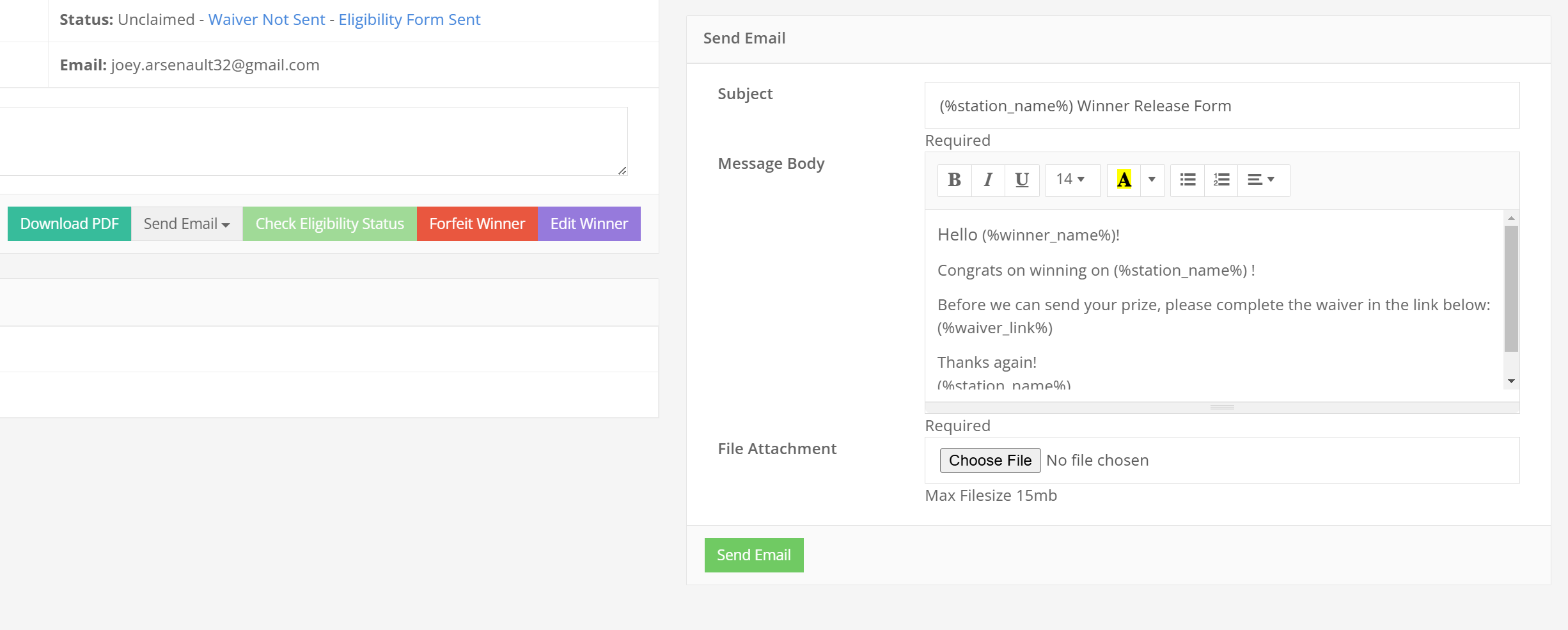 Once you're happy with the message body, add a subject and click the green "Send Email" button. SPARC will automatically send the email to the address provided by the winner.