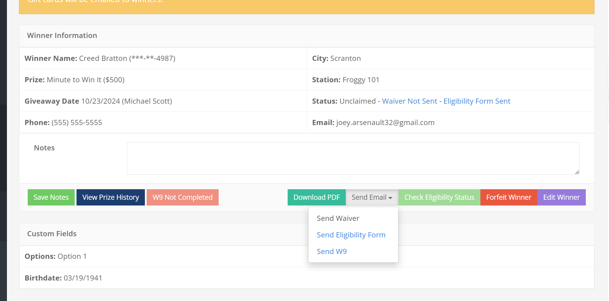 Select Winner Management from the sub-menu. (If you do not see Prize Management, you do not have sufficient permissions)