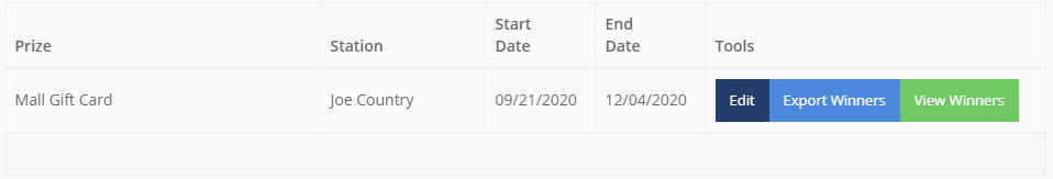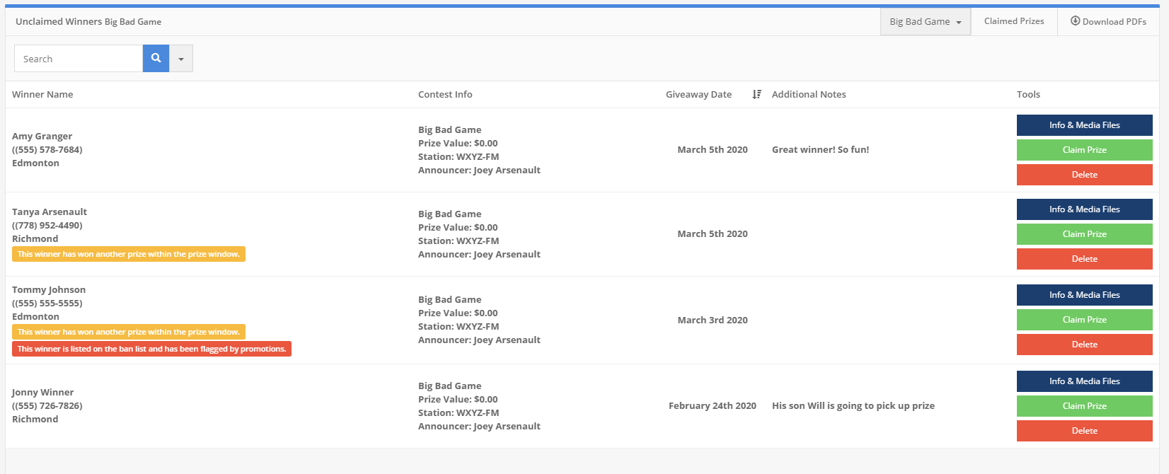 On this screen, you can see the winner’s name, phone number, city. You can also see the station that won the prize on, the announcer that entered the prize and the giveaway date.