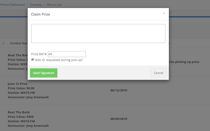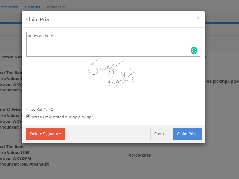 You can "Delete Signature" and they will be forced to sign again, create notes about the winner or if everything looks good, click "Claim Prize". You're done!