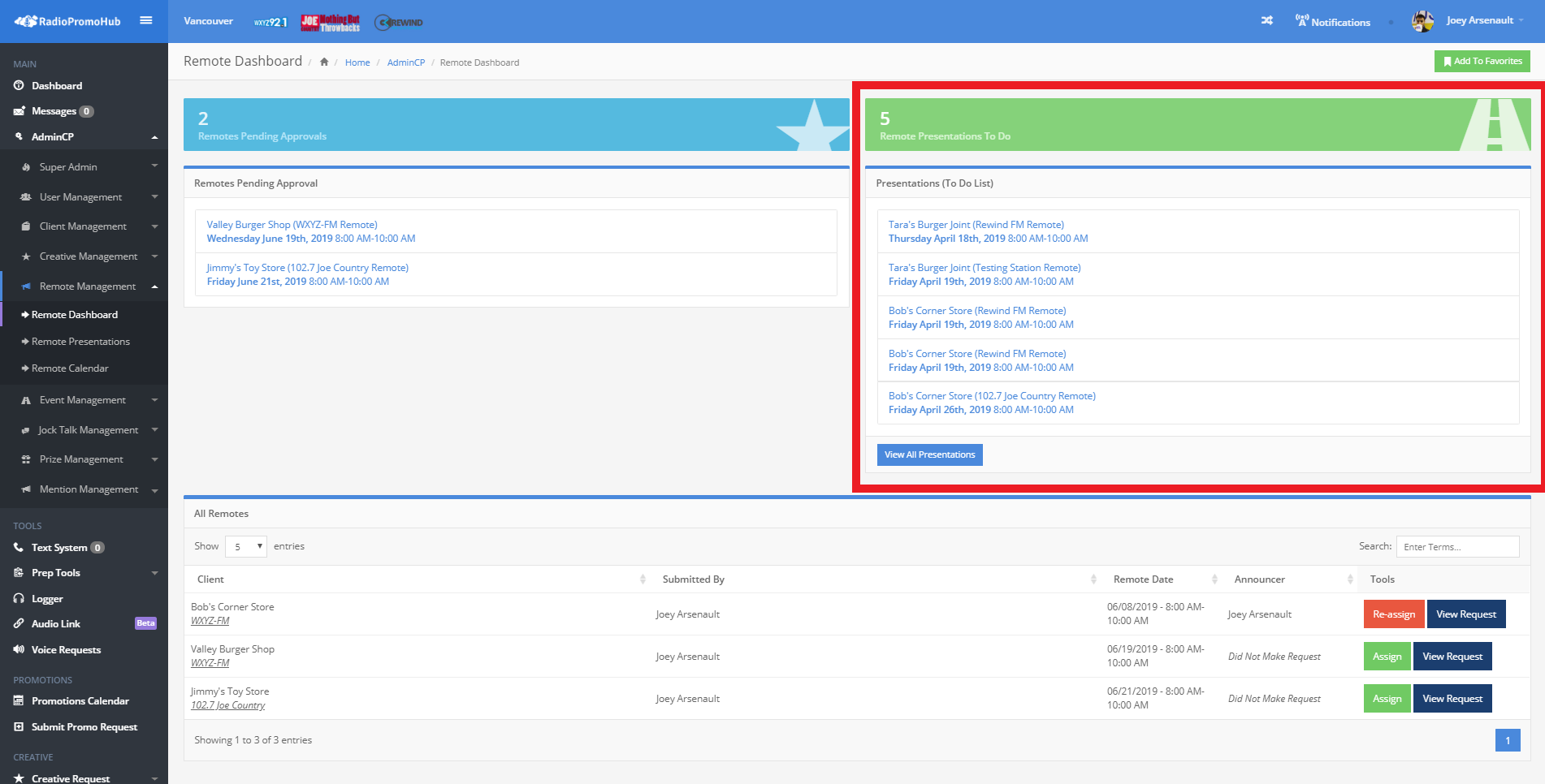 The next section is the remote presentations "To Do List". This list shows you all remotes that still require a wrap-up presentation. To learn more about creating remote presentations, click here.
