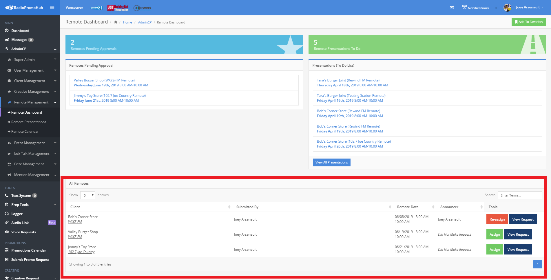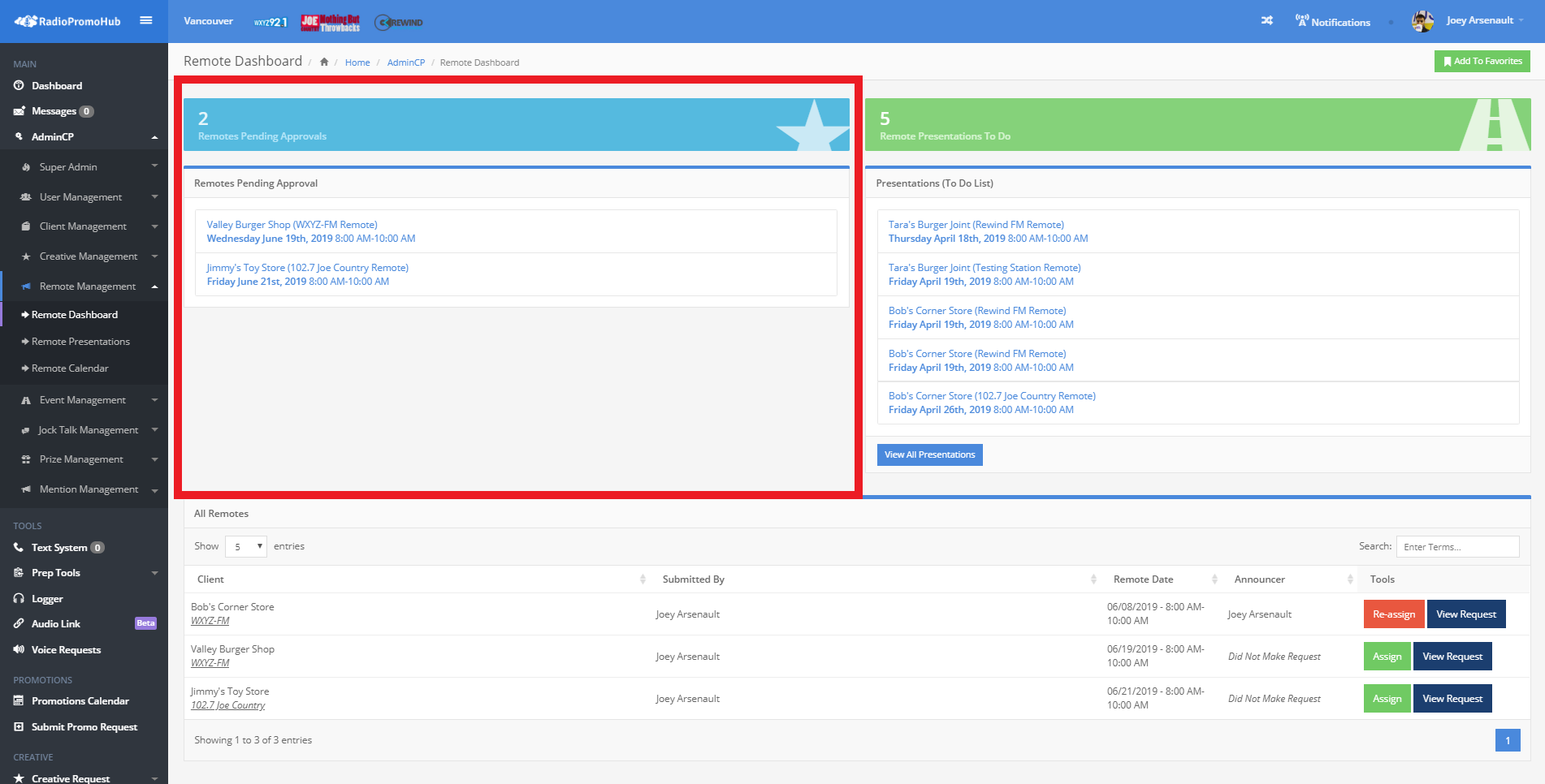 The Remote Dashboard is where all remotes are approved, assigned a team and where wrap-up presentations are created.