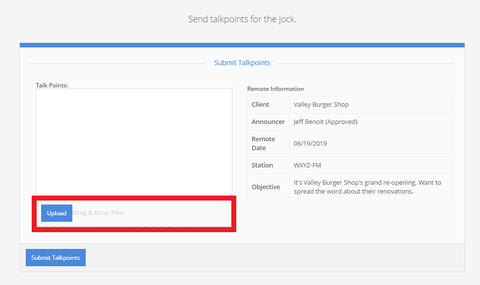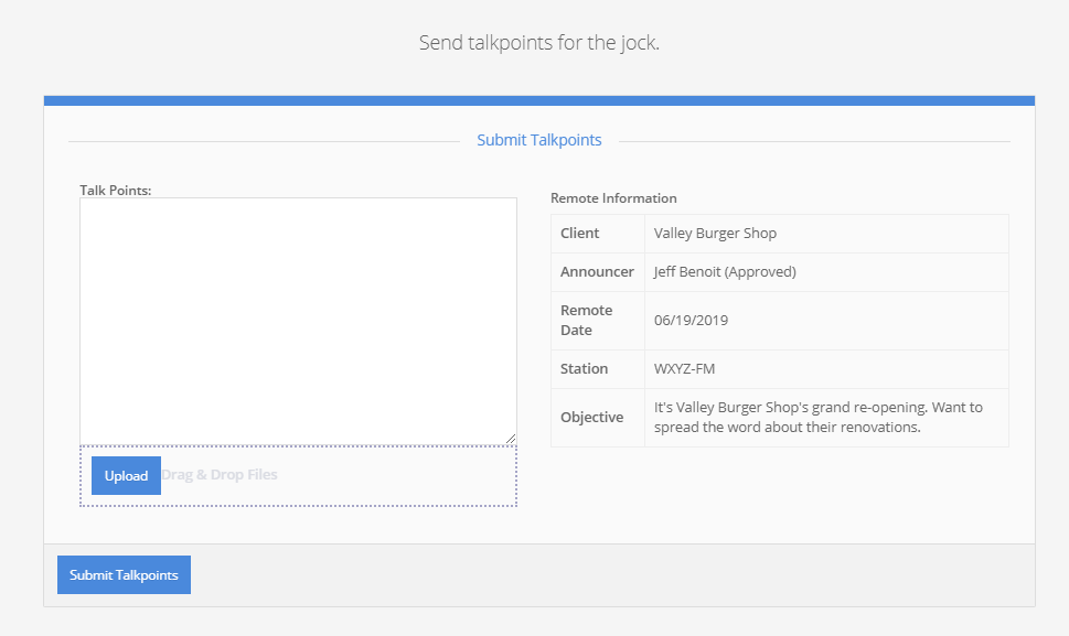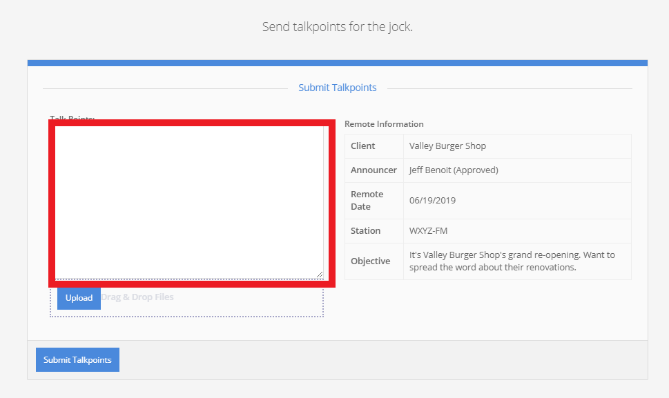 You've scheduled your remote now you need to submit talkpoints for the jock. This is also done in SPARC Media Hub, no more emails back and forth.