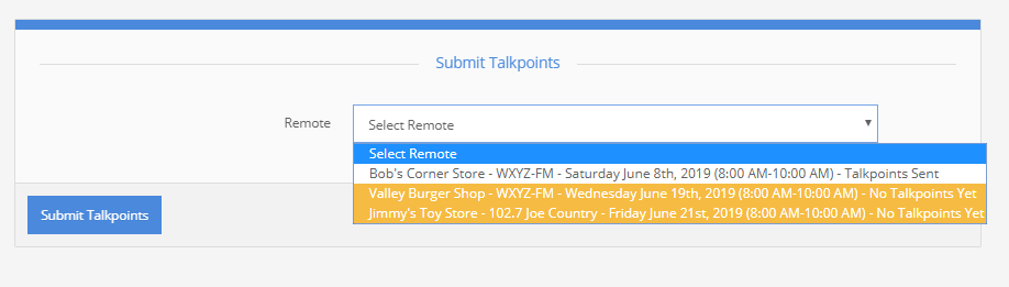 Select the remote you'd like to submit talkpoints to in the dropdown menu. Remotes highlighted in yellow have not received talkpoints.