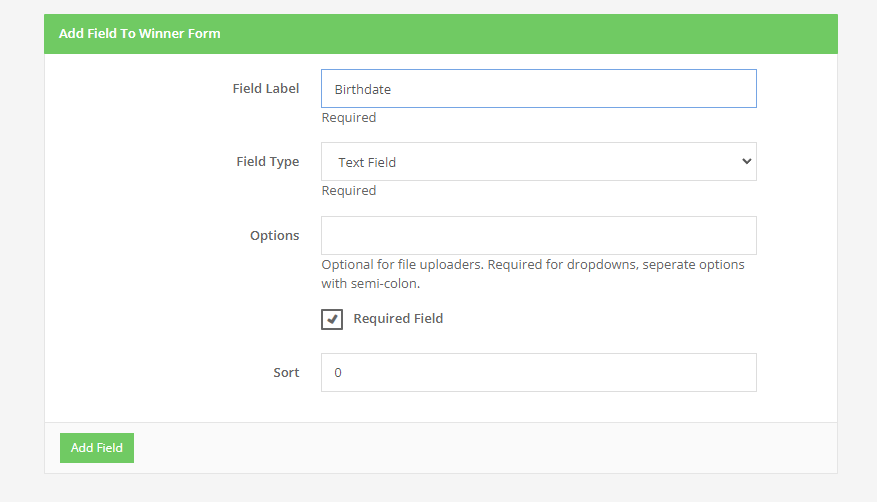 Dropdown - This allows users to pick from a list of options in a dropdown menu. To specify the options, add each option in the "Options" section directly below "Field Type". Separate each option with a semi-colon (;).