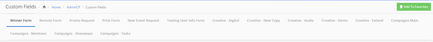 Once on this screen, choose the form you'd like to add custom fields to from the options listed at the top of the screen.