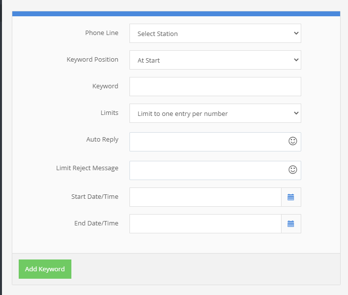 End Date/time: This is the date and time that you would like the keyword to become inactive. All text messages containing your keyword will not be entered into the keyword campaign outside of the start and end dates.