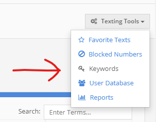 Once in the Texting Platform select the "Texting Tools" dropdown and click "Keywords"