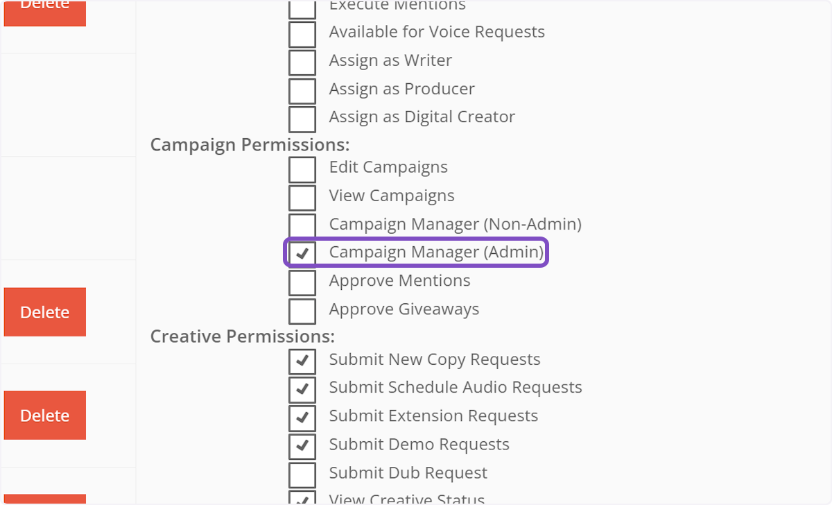 6. To allow a user to approve entire campaigns, check off the permission "Campaign Manager (Admin)"