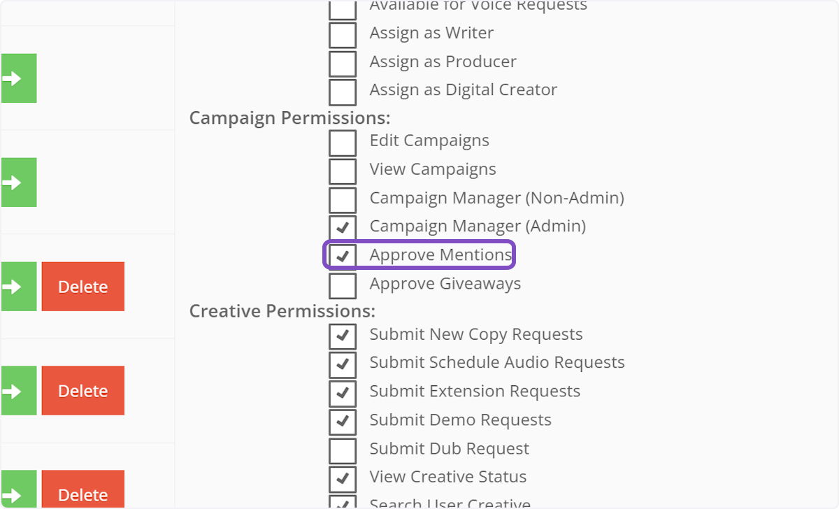 7. To allow a user to only approve Mention requests within campaigns, check off the permission "Approve Mentions"