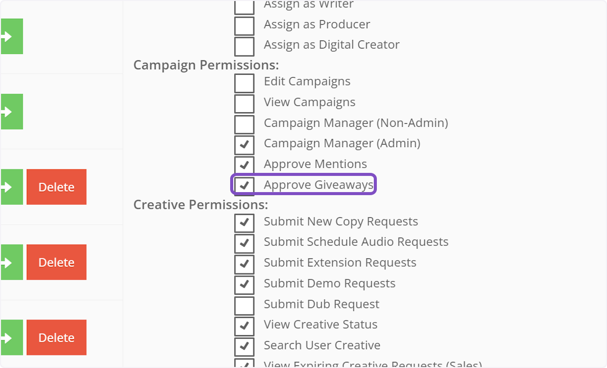 8. To allow a user to only approve Contest/Giveaway requests within campaigns, check off the permission "Approve Giveaways"